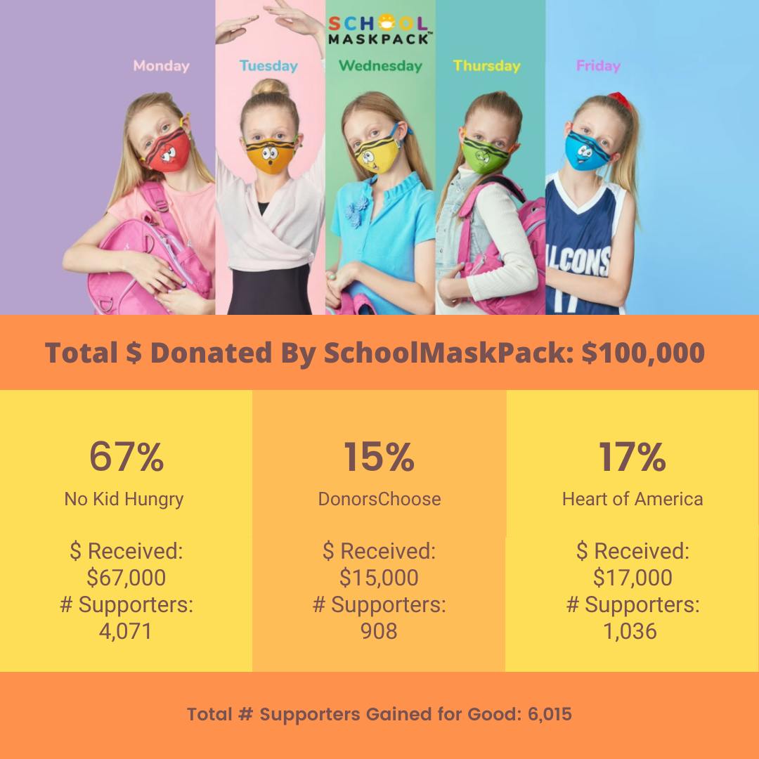 "In collaboration with in/PACT, customers had the opportunity to help direct where SchoolMaskPack gives back to the community by choosing one of three charities that support kids who are impacted by the Covid-19 pandemic - DonorsChoose, No Kid Hungry, and Heart of America."