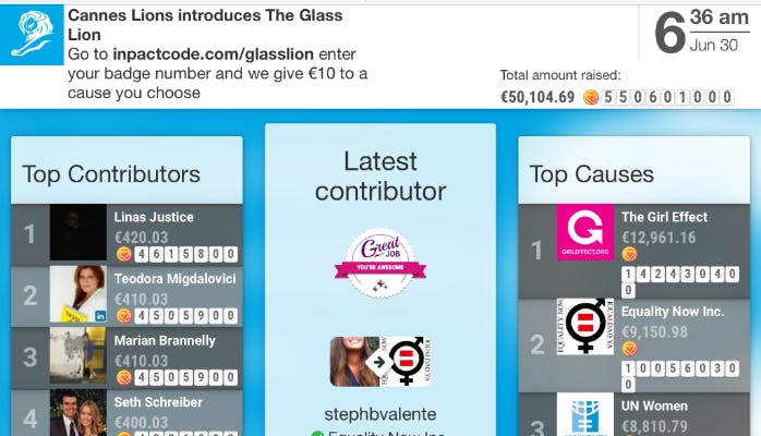 Using their Cannes Lions badge numbers, delegates were able to consult the list of causes to make their selection and direct anywhere from 10 euros to 100 euros to one of the ten causes. As they did so, their pictures popped up on the LeaderBoard on display at the Palais de Festivals in Cannes. At the end of the week, The Girl Effect was leading the pack of worthy gender equality causes.
