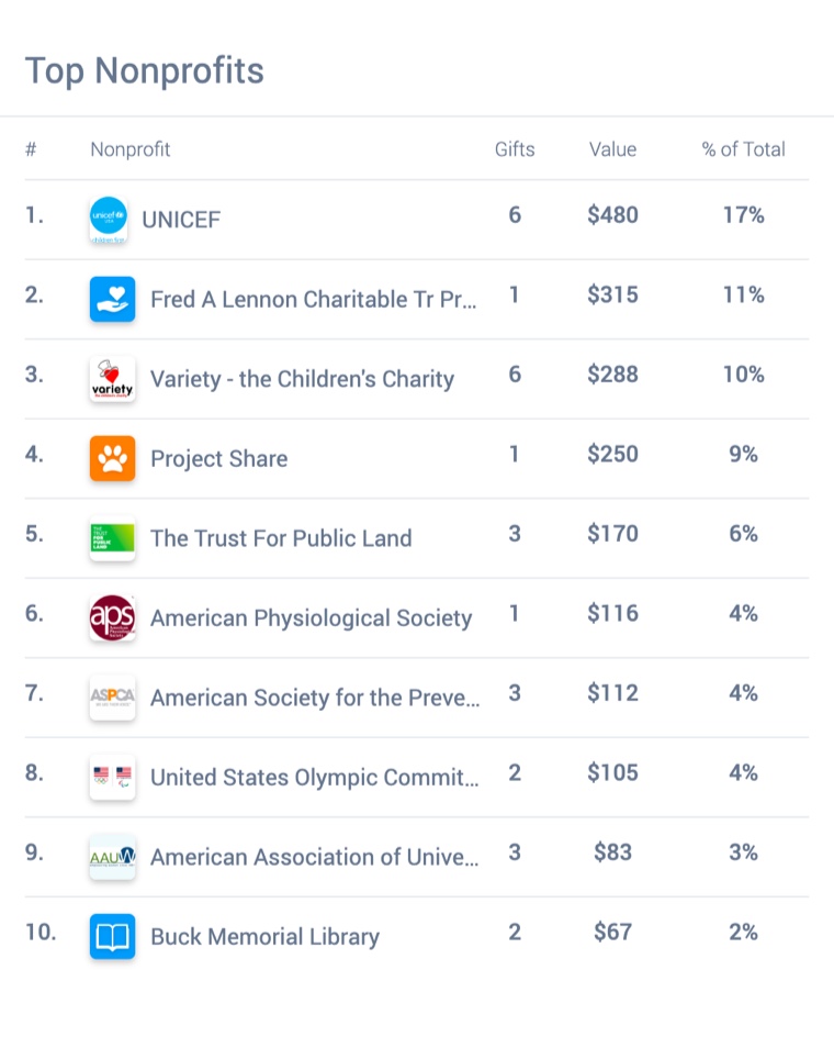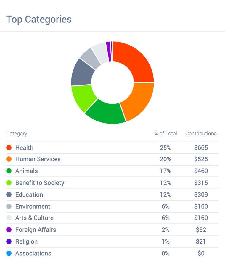 Our user-friendly dashboard provides an at-a-glance view of key giving metrics, including top nonprofits and categories, user and donation counts, recurring contributions, and average donations.