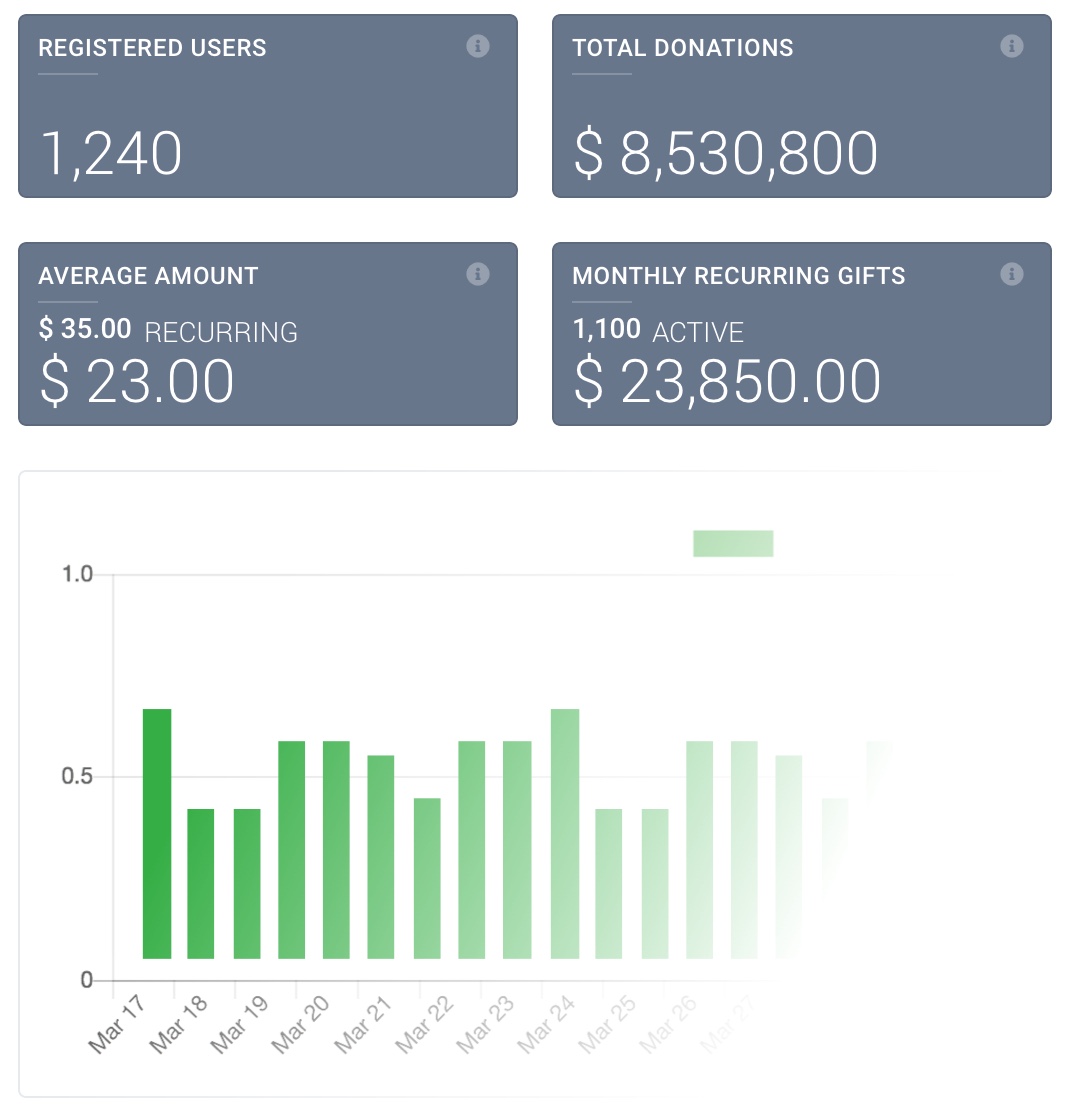 Our user-friendly dashboard provides an at-a-glance view of key giving metrics, including top nonprofits and categories, user and donation counts, recurring contributions, and average donations.